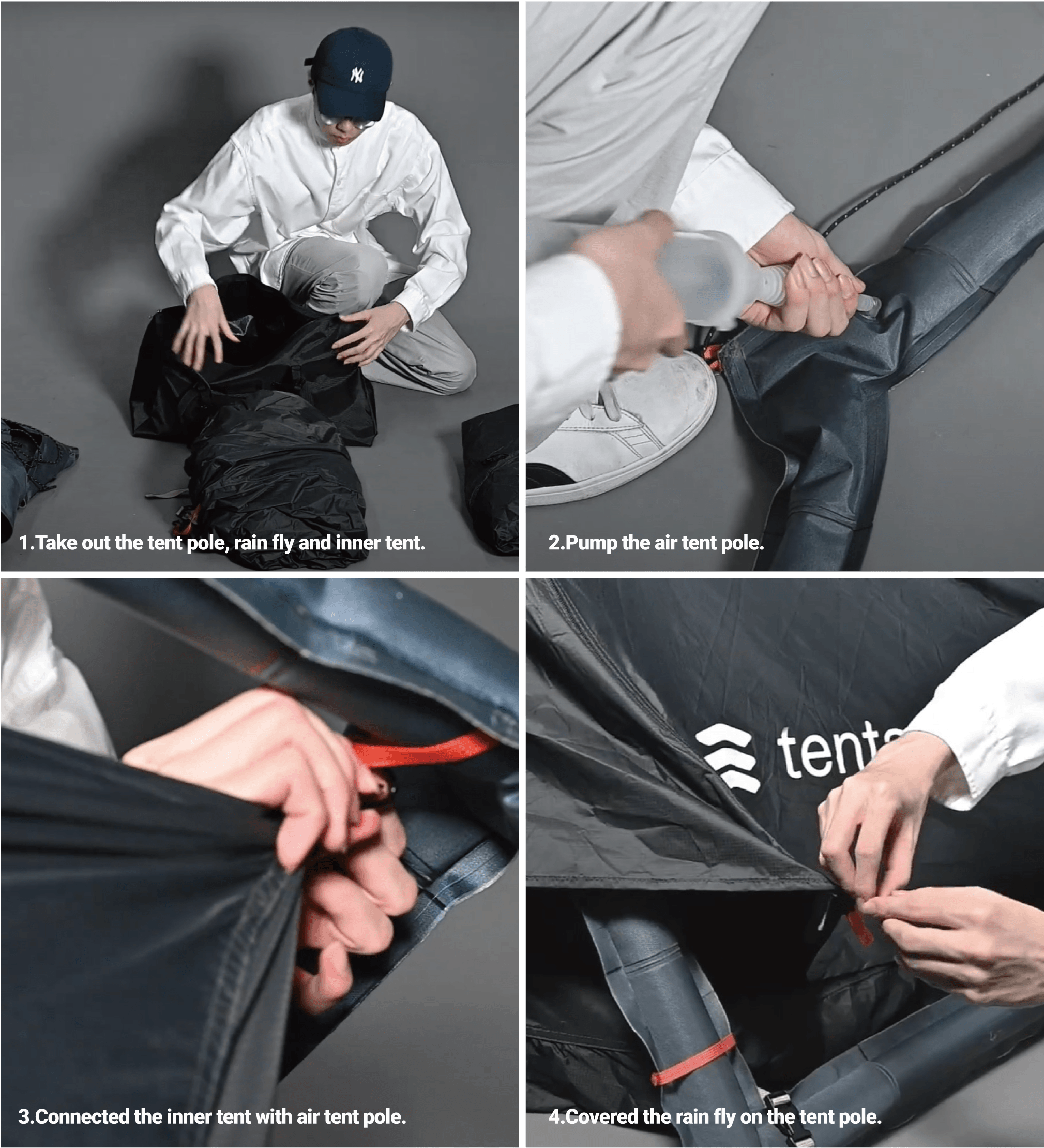 A cross-dimensional air pole system connects the entire framework into a single unit, allowing the tent to be inflated in one step.