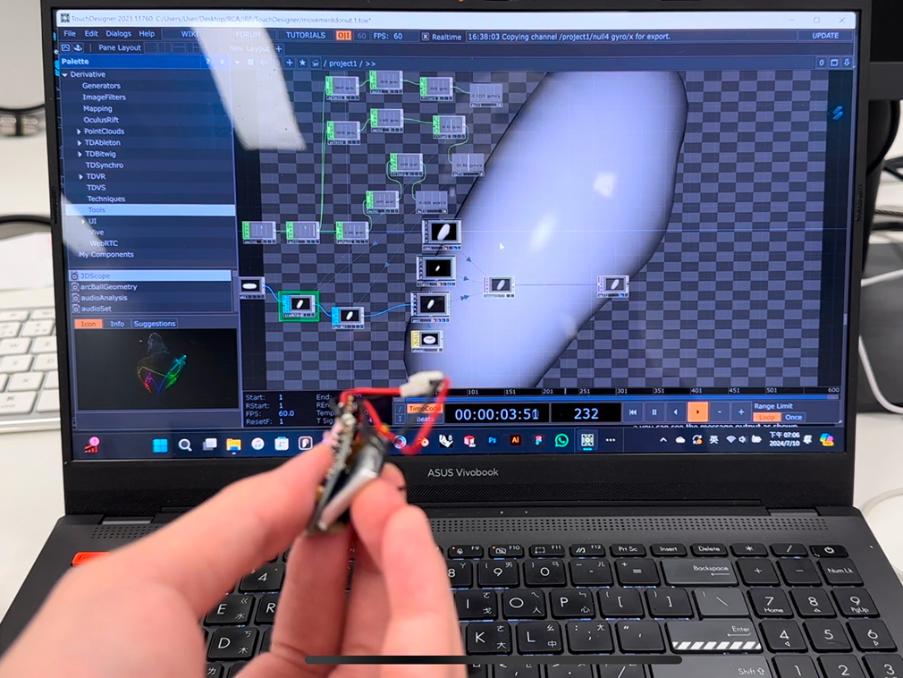 At the same time, TouchDesigner provides real-time visual feedback on the screen, enhancing the overall interaction.