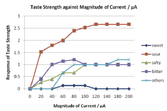 The motion sensors translate movement such as acceleration and rotation into varying levels of microcurrent to create different tastes.